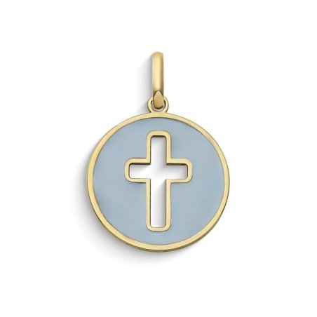 Ciondolo donna tondo con croce in Oro giallo 375‰ e smalto azzurro.